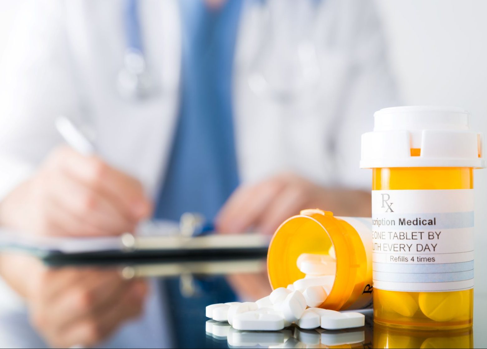 male-doctor-writing-on-a-clipboard-beside-prescription-medication-bottles